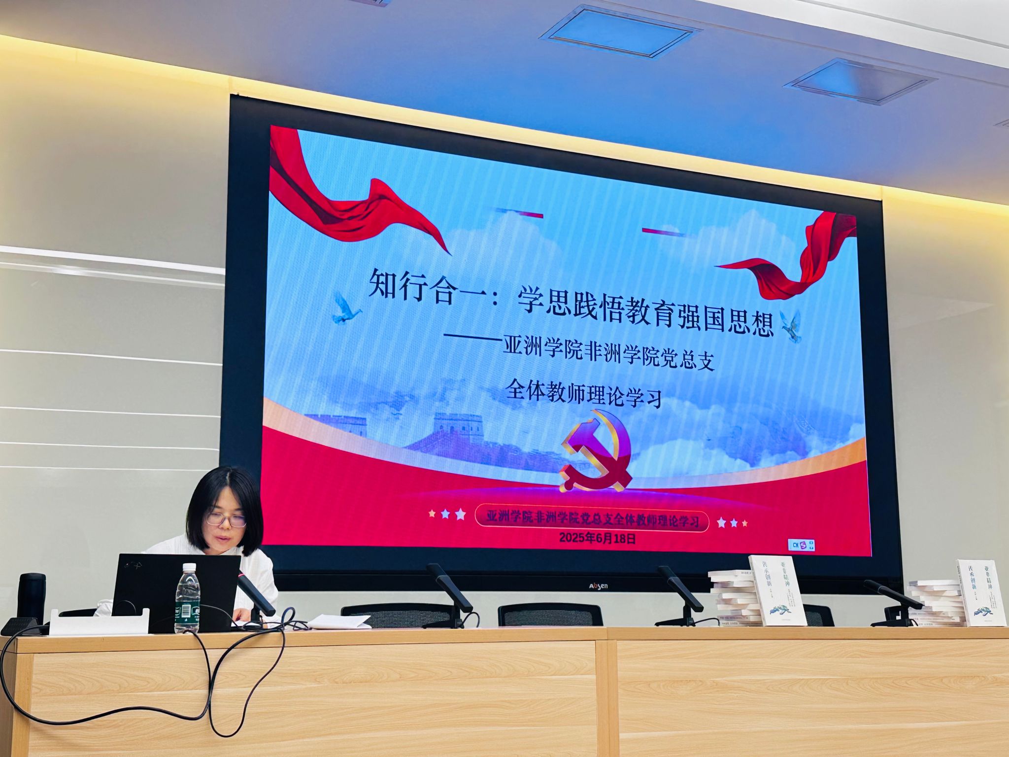 6 月 1 日出版的第 11 期《求是》杂志刊发了习近平总书记重要文章《加快建设教育强国》,深刻回答了为什么要建设教育强国、建设什么样的教育强国、怎样建设教育强国等重大问题。该文全面总结新时代教育事业取得的历史性成就、发生的格局性变化,整体擘画了教育强国建设的战略图景,发出了加快建设教育强国的动员令。为深入学习习近平总书记关于教育的重要论述,进一步提升开云kaiyun体育、非洲学院教师队伍的理论素养和使命担当,6月18日下午,开云kaiyun体育、非洲学院党总支组织开展了以“知行合一:学思践悟教育强国思想”为主题的理论学习活动。两院全体教师参加学习,开云kaiyun体育第二教工支部书记曾琼主持。