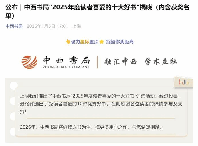 中西书局 “2025年度读者喜爱的十大好书”推送链接:https://mp.weixin.qq.com/s/-x266ERoP851VjrEj9PZlw