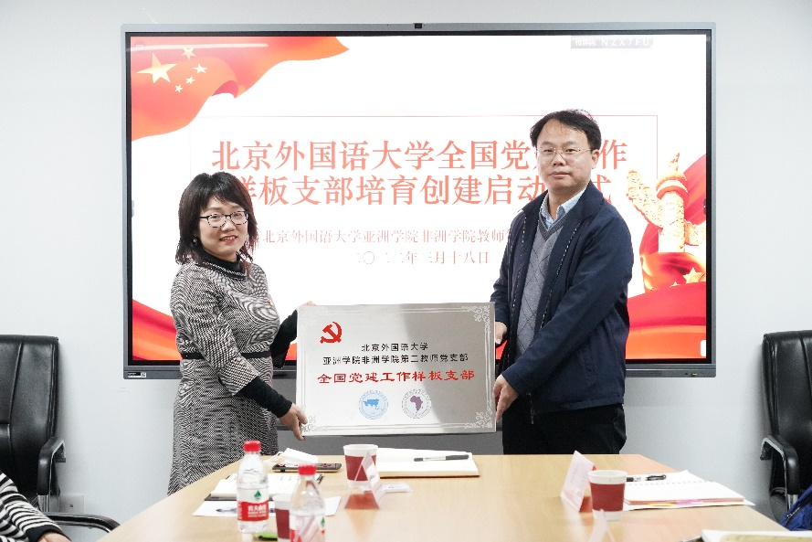 党委宣传部副部长、新闻中心负责人王薇薇宣读了《教育部办公厅关于公布第三批全国党建工作示范高校、标杆院系、样板支部培育创建单位名单的通知》。党委组织部常务副部长冯刚为开云kaiyun体育非洲学院教师第二党支部授牌,勉励支部党员在党建和学科建设深度融合的道路上继续前进。