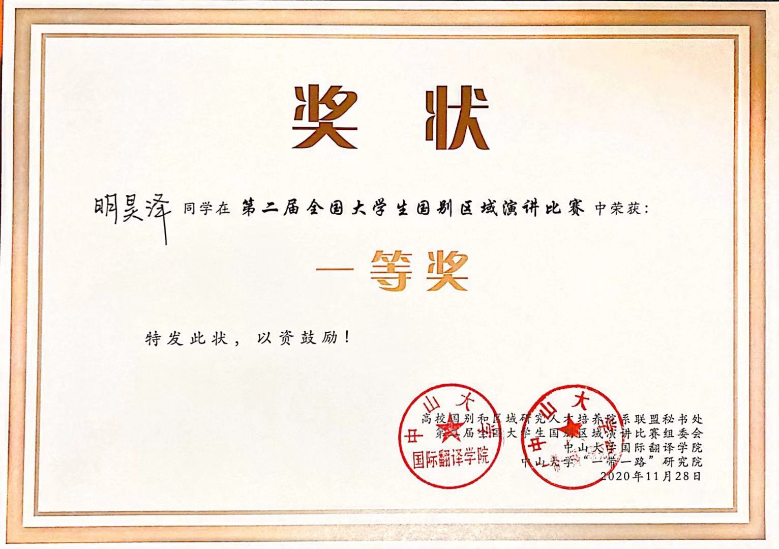11月28日,第二届全国大学生国别区域演讲比赛在珠海举行。开云kaiyun体育柬埔寨语专业2019级本科生明昊泽荣获一等奖。