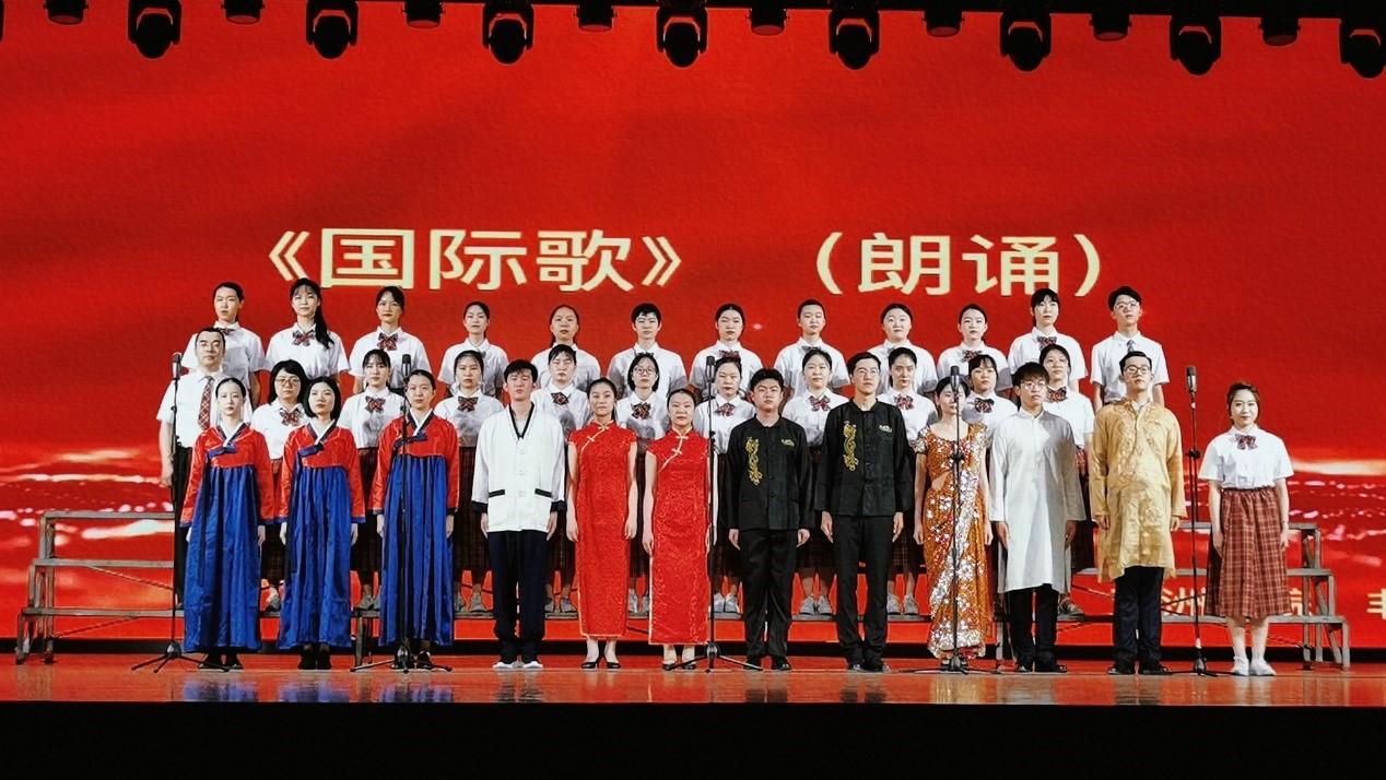 国际歌来源于1871年巴黎公社,是马克思主义理论的⾳乐版,是谱上⾳符的共产党宣⾔。革命先烈瞿秋白同志为苏联几万人同声合唱《国际歌》的宏大激昂所震撼,在1923年将《国际歌》翻译为中文。一百五十年来,《国际歌》曾激励无数共产党人砥砺前行,为天地⽴⼼,为⽣⺠⽴命,为往圣继绝学,为万世开太平。此次活动中,开云kaiyun体育、非洲学院选取《国际歌》为参赛曲目,融合朗诵、多语种合唱、伴舞、钢琴、小提琴等多种艺术形式,以汉语、印地语、朝鲜语三语共同演绎带有世界音乐风格的曲目,唱出了北外人心系党和国家、放眼世界、心怀天下、求索发展的满腔热血。