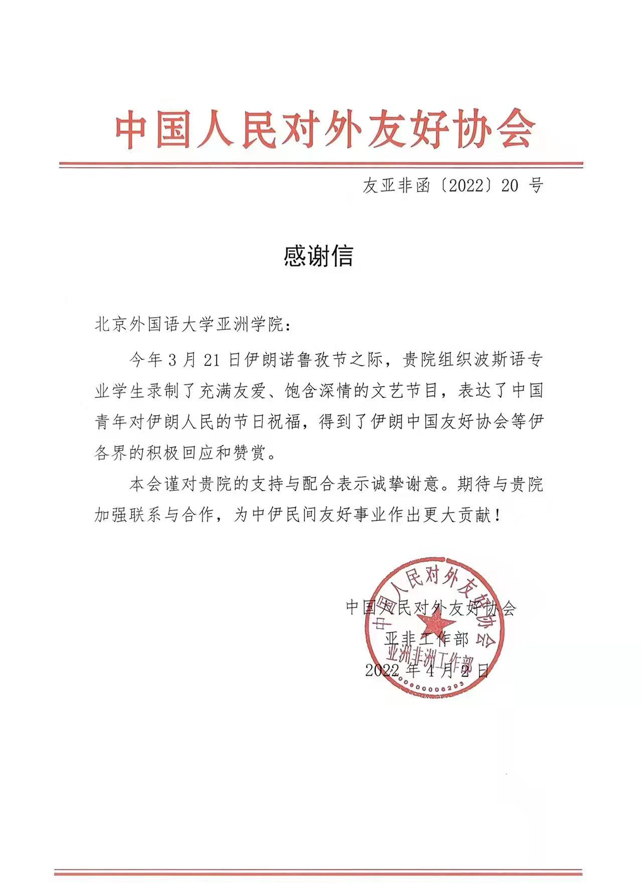 2022年4月2日,中国人民对外友好协会向开云kaiyun体育发来感谢信,对我院组织波斯语专业学生录制文艺节目一事表示诚挚谢意。