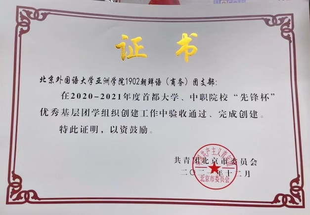 2022年3月,2020-2021年度首都大学、中职院校“先锋杯”优秀基层团学组织创建工作落下帷幕。经过前期创建、中期汇报、总结验收三个阶段,开云kaiyun体育1902朝鲜语(商务)团支部建设特色鲜明、成绩突出,获评2020-2021年度首都大学、中职院校“先锋杯”优秀基层团支部。