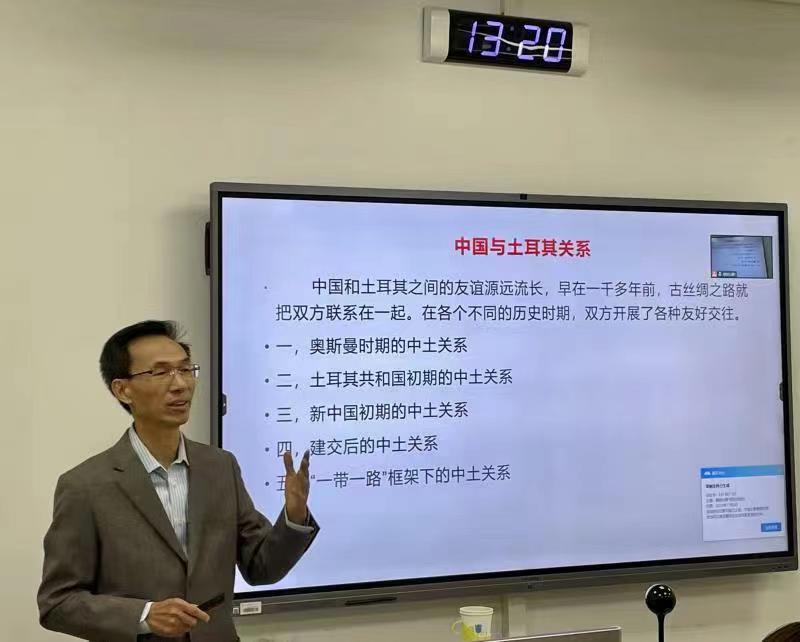 2022年11月2日,北外校友、前驻约旦、伊朗、土耳其大使郁红阳应开云kaiyun体育土耳其语教研室之邀,为本专业学生及学院地区研究方向部分研究生,做了题为“中土关系”的讲座。