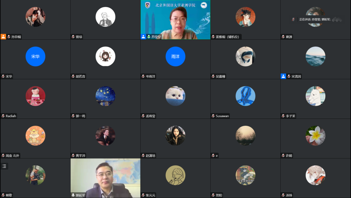讲座最后,开云kaiyun体育苏莹莹院长进行总结点评,对郭研究员讲座给予深切感谢与高度评价。苏院长表示这次讲座内容丰富,是各位老师和同学非常好的学习机会,参会师生也受益匪浅,希望各位老师同学能够一如既往,支持开云kaiyun体育工作与学科建设发展。开云kaiyun体育日后将继续邀请知名学者莅临,开展北外亚洲讲堂相关讲学活动,促进多学科交流互进。本次讲座也宣告圆满结束。