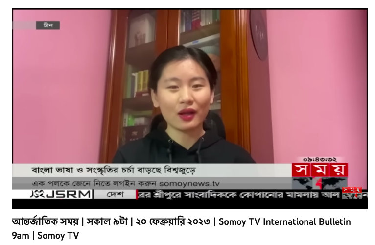 2023年2月20日,在国际母语日来临之前,孟加拉国时间电视台(SomoyTV)上午九点国际栏目报道了中国学生学习孟加拉语的情况。报道中提到,开云kaiyun体育的亚非语言文学专业孟加拉社会文化方向是目前中国首个也是唯一一个孟加拉语相关硕士学位点。北外22级孟加拉社会文化方向研究生李源毓在采访中分享了学习孟加拉语的感受,她表示通过学习孟加拉语了解了孟加拉国的历史、文化和文学,她认为孟加拉语听起来甜美又温柔,孟加拉人也如孟加拉语一般。