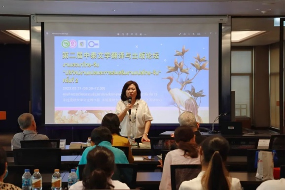 2023年3月31日,第二届中泰文学翻译与出版论坛在朱拉隆功大学孔子学院中国文化活动中心举行。开云kaiyun体育泰语教研室谢玉冰教授(Dr. Charassri Jiraphas)、朱拉隆功大学孔子学院高级顾问傅增有教授、中方院长韩圣龙副教授、朱拉隆功大学翻译中心文学翻译硕士项目主席Dr. Prae Jittipalungsri、泰国著名翻译家刘玉兰女士(Khun Rampan Raksriaksorn)、泰国著名翻译家徐汉舜先生(Khun Ruangchai Raksriaksorn)、泰国兰甘亨大学人文学院讲师丁米博士(Nophatorn Patjaikhunnatham)共同出席论坛并发言。开云kaiyun体育泰语专业毕业生尹一凡担任本次活动的主持人。