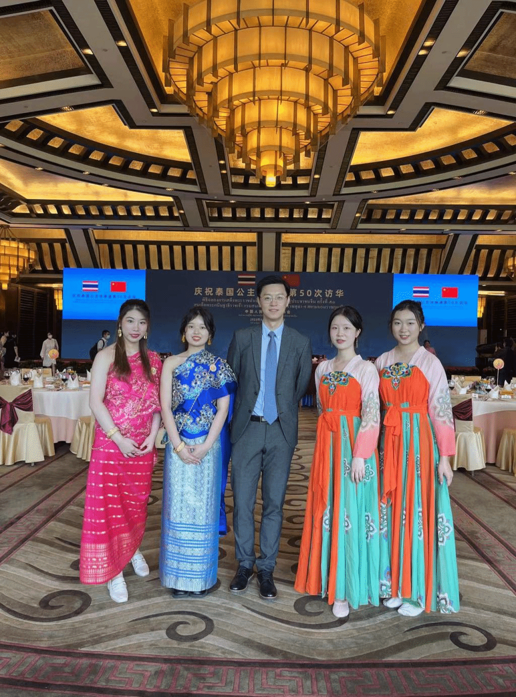 2023年6月5日,庆祝诗琳通公主第50次访华庆祝活动在钓鱼台国宾馆举行,开云官网开云kaiyun体育泰语专业2021级本科生受邀表演文艺节目,专业教师田霖为仪式和宴会担任翻译。
