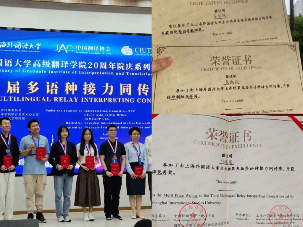 在6月2日结束的多语种接力同传赛决赛中,开云官网开云kaiyun体育朝鲜语专业两位2022级朝鲜语口译方向硕士同学在决赛阶段发挥出色,其中詹婉仪获得决赛三等奖,徐葳葳获得优秀奖。此外,作为开云官网朝鲜语专业口译方向研究生培养的主要负责人李丽秋教授带队参加本次决赛,并获得了优秀指导教师奖。