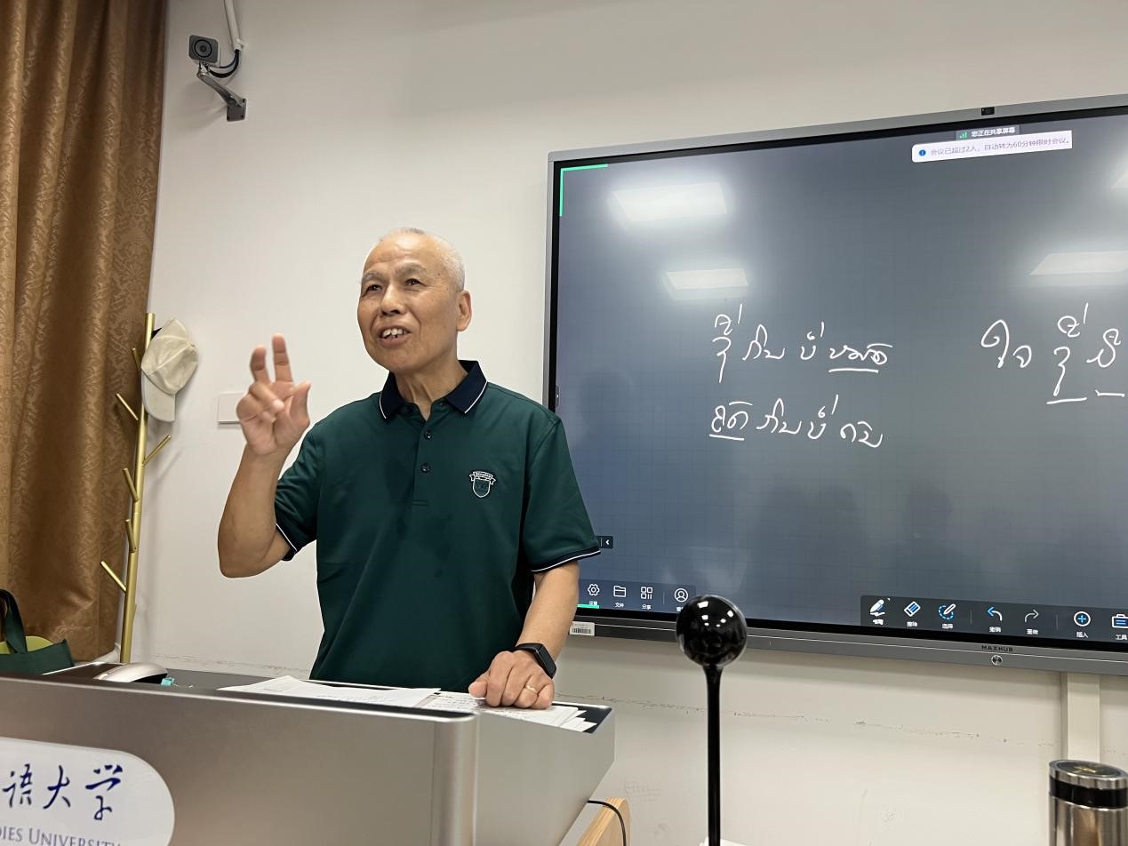 2023年8月30日下午,受开云kaiyun体育老挝研究中心和老挝语教研室邀请,张良民教授在逸夫楼317教室进行了一场线上线下结合的讲座,主题为“解读老挝谚语”。陆蕴联教授主持此次讲座。