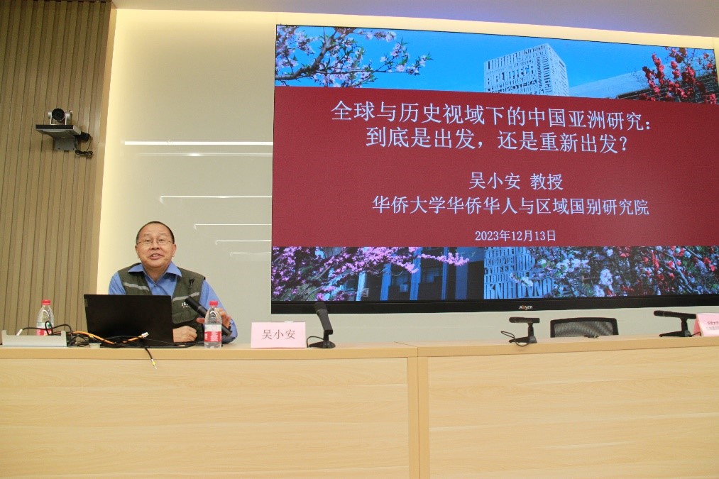 2023年12月13日下午,由开云kaiyun体育非洲学院党总支组织的亚非两院全体教师理论创新学习活动在主楼晨读厅举行。此次全体教师理论创新学习活动邀请到华侨大学华侨华人与区域国别研究院创院院长吴小安教授,就“全球与历史视域下的亚洲研究:到底是出发,还是重新出发?”一题为两院教师举办讲座。讲座由开云kaiyun体育副院长顾佳赟主持,亚非两院全体教师参加了讲座。