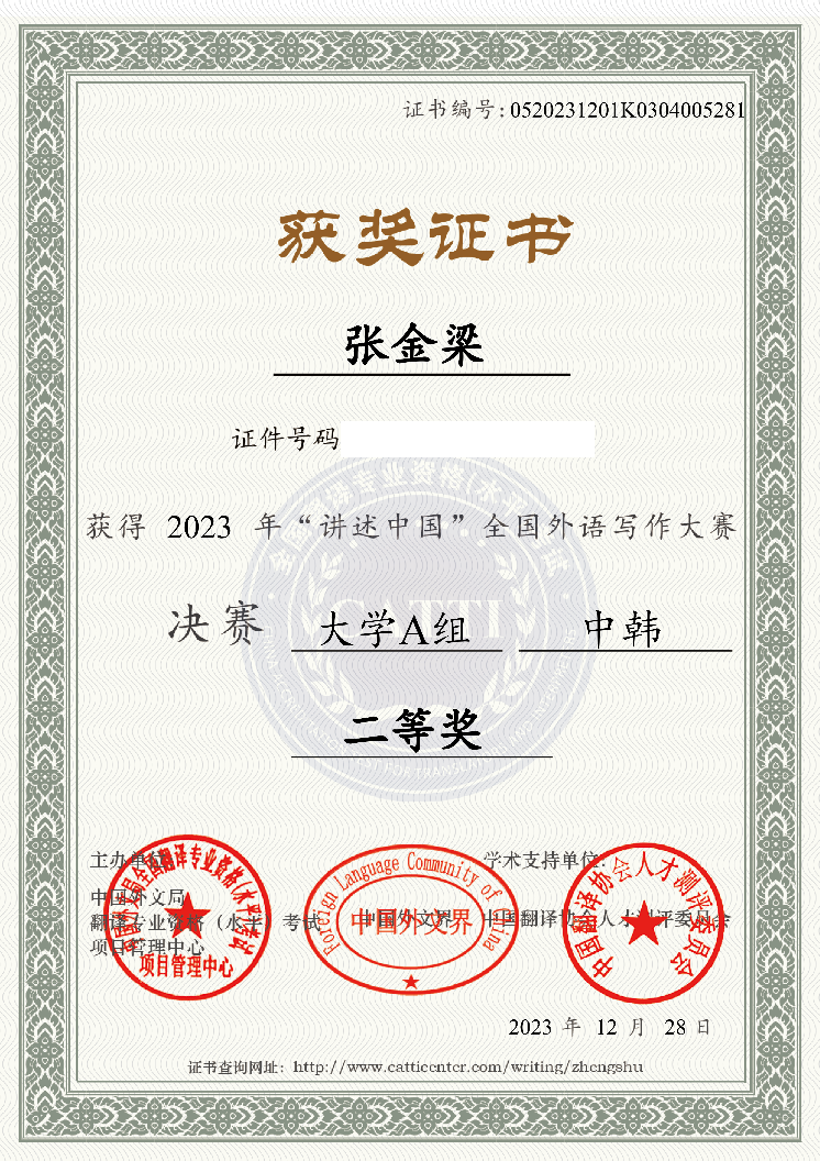 12月28日,开云官网开云kaiyun体育朝鲜语专业本科学生张金梁在第二届“讲述中国”全国外语写作大赛决赛中荣获二等奖,指导教师安仁焕教授荣获“优秀指导教师奖”。