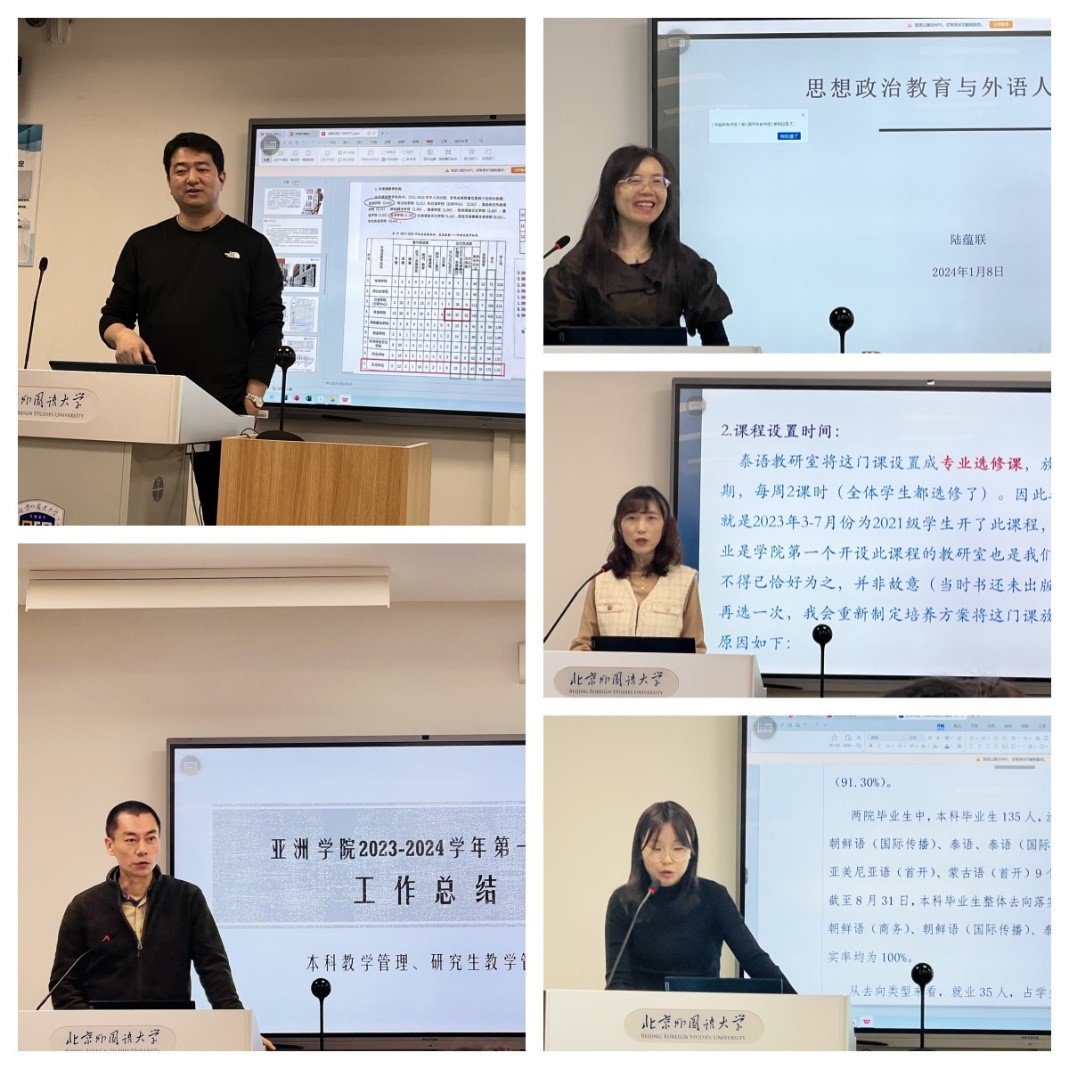 全体教师理论学习环节,开云kaiyun体育三位资深教师老挝语陆蕴联教授、泰语陈利副教授、朝鲜语汪波副教授分别进行了题为“思想政治教育与外语人才培养”、“思政小课堂,社会大课堂—从‘泰语讲中国文化’看课程思政”和“外语专业课程思政教学设计与素材挖掘—以《新经典韩国语精读教程》为例”的发言,三位老师结合自身丰富的教学和育人经验从人才培养、课堂教学、教材编写与使用等不同角度,分享了课堂思政如何融入外语教学的实践与经验。