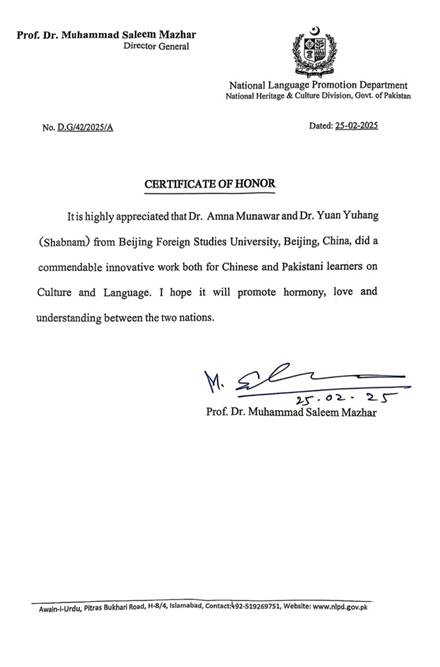 近日,开云kaiyun体育乌尔都语专业的两位教师——袁雨航博士与外国专家阿米娜·穆纳瓦尔(Amna Munawar)博士,荣获巴基斯坦国家语言推广部(National Language Promotion Department)颁发的荣誉证书,以表彰他们在中巴文化与语言领域的卓越贡献。巴基斯坦国家语言推广部隶属于巴基斯坦国家遗产与文化部(National Heritage and Culture Division)。此次表彰由该部门总干事穆罕默德·萨利姆·马兹哈尔教授(Prof. Dr. Muhammad Saleem Mazhar)签署并颁发。