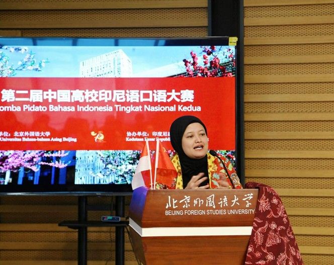 艾菲在致辞中高度评价了中国高校印尼语教育的发展水平,尤其对北外印尼语专业、北外中印尼人文交流研究中心所取得的成就表示赞赏,并寄语参赛选手赛出风采、赛出水平。