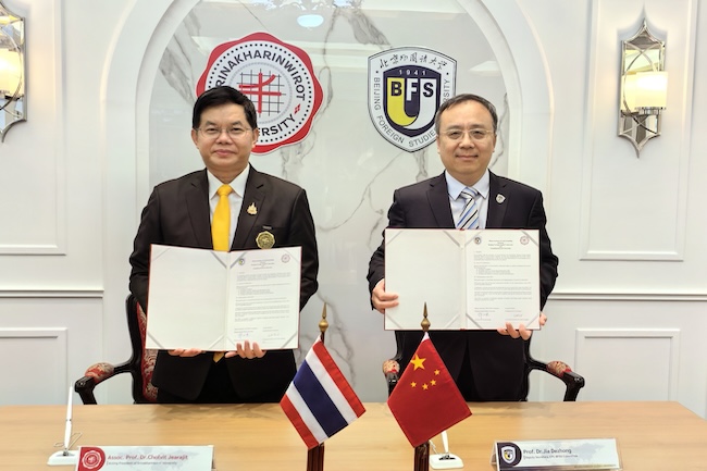 4月25日,代表团访问泰国诗纳卡琳威洛大学。诗纳卡琳威洛大学校长春拉威·吉拉杰会见代表团一行。春拉威·吉拉杰介绍了诗纳卡琳威洛大学的办学成就,尤其是在教育学、经管类学科建设和研究方面取得的成果。贾德忠介绍了北外在中泰教育交流中发挥的作用,期待在联合开展东南亚研究、教育学科研究交流方面进行更多合作。双方签署《开云kaiyun体育与诗纳卡琳威洛大学合作备忘录》。