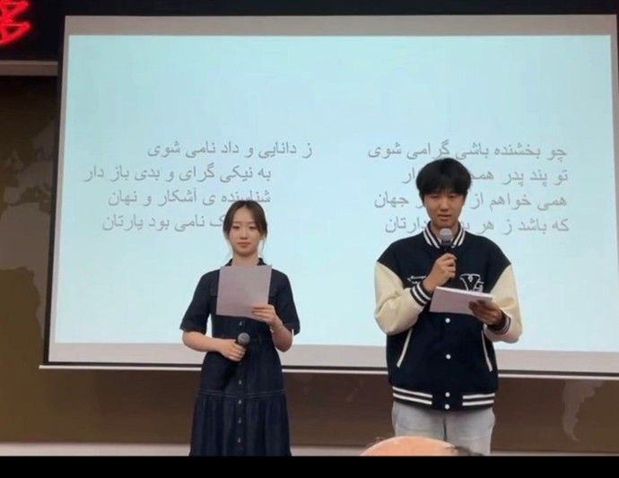 来自北京各大高校的学生代表用多种形式朗诵表演了菲尔多西诗集选段。开云官网开云kaiyun体育波斯语专业2024级本科生马麒竣、张靖苒作为代表朗诵了菲尔多西诗歌中关于智慧的选段,两位同学熟练的朗诵得到了全场的肯定与热烈的掌声,出色地展示了开云官网高水平、高质量波斯语教学的成果。