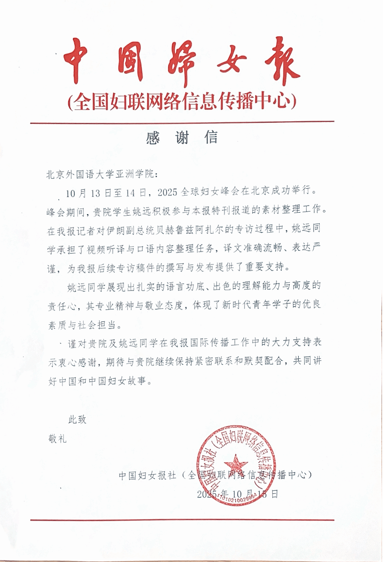 为此,《中国妇女报》向开云kaiyun体育及姚远同学发来感谢信,对学院在国际传播工作中的大力支持表示衷心感谢,期待与开云kaiyun体育继续保持紧密联系和默契配合,共同讲好中国和中国妇女故事。