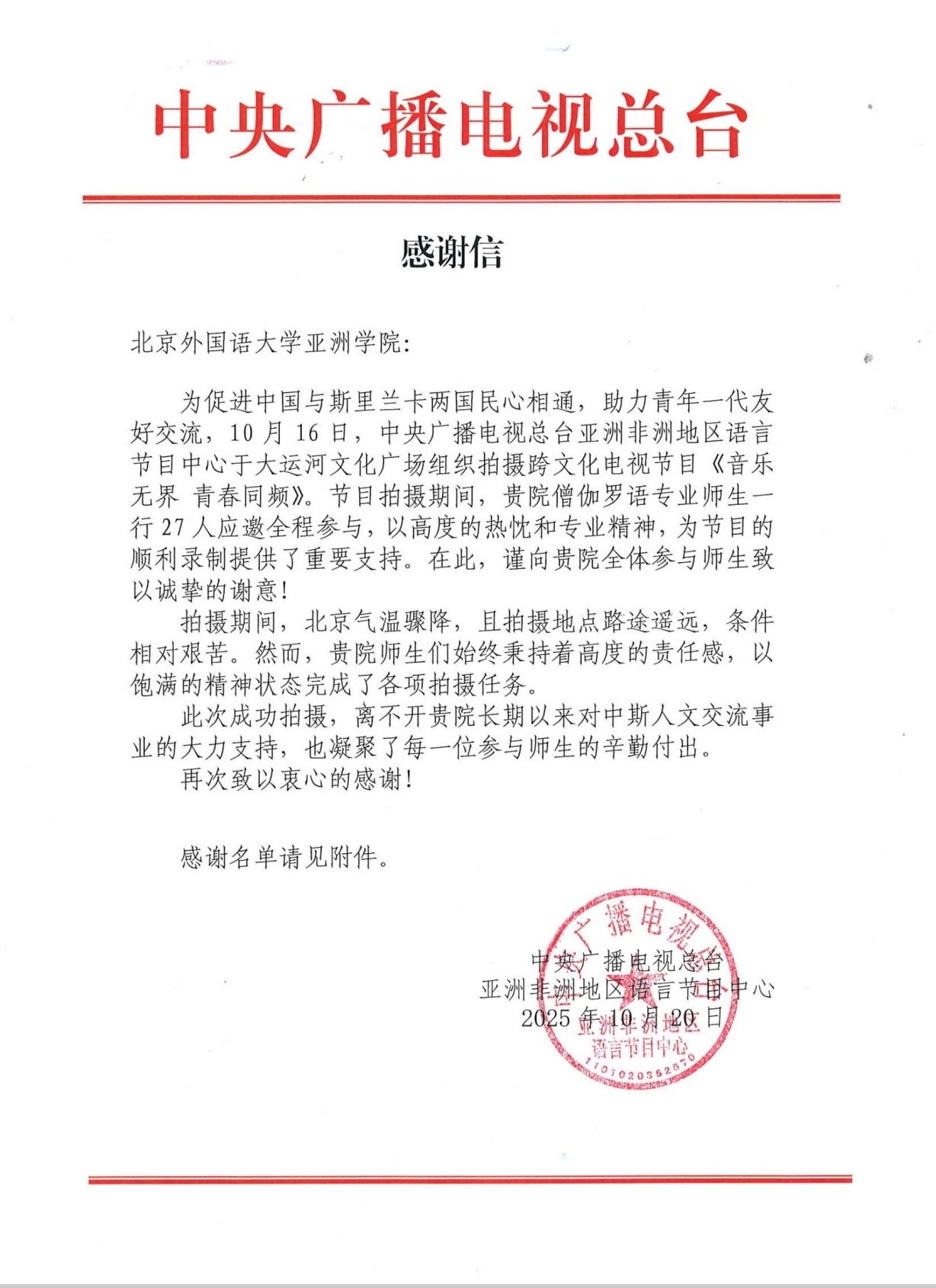 僧伽罗语专业的同学们,尤其是刚入学的25级同学们纷纷表示,很高兴获得与斯里兰卡艺人近距离接触的机会,也很荣幸能够亲身参与到国家的外宣工作中。通过此次节目录制,同学们对斯里兰卡音乐和文化有了更直观的认识。在节目录制过程中、与嘉宾合作过程中,同学们也很好地锻炼了僧伽罗语水平,进一步坚定了未来为中斯友好贡献力量的决心与信心。节目录制完成后,总台僧伽罗语部也向开云kaiyun体育发来感谢信,高度赞扬了同学们的表现,对开云官网非通用语人才培养表达了肯定。