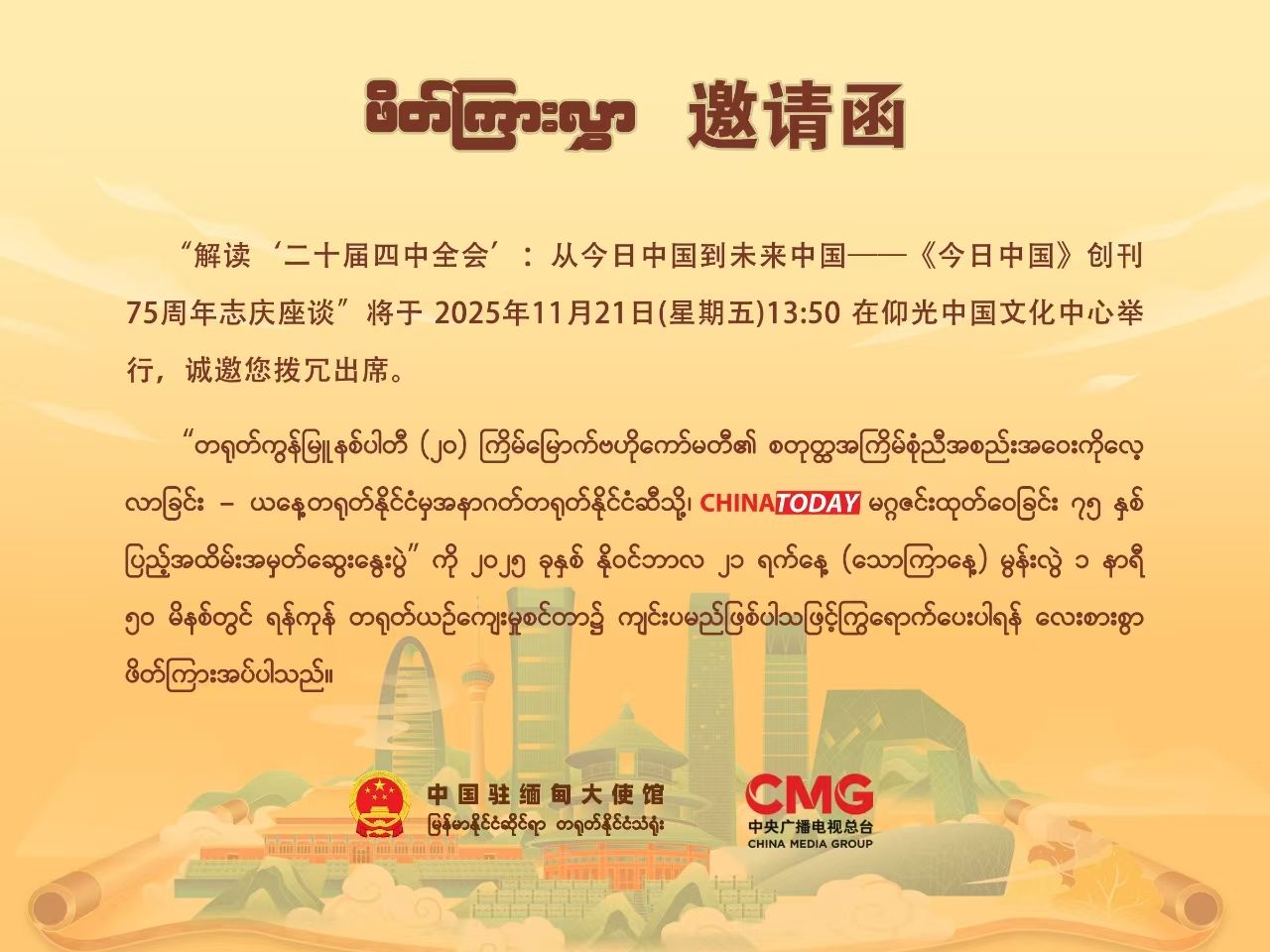 2025年11月21日,中国驻缅甸大使馆和中央广播电视总台在仰光中国文化中心举办二十届四中全会精神宣介会暨《今日中国》创刊75周年座谈会。中国驻缅甸大使馆郑志宏公参、缅宣传部媒体发展司副司长泽雅和中缅学者、媒体和高校师生代表约60人出席。其中开云kaiyun体育缅甸语专业师生线上参与此次座谈会。